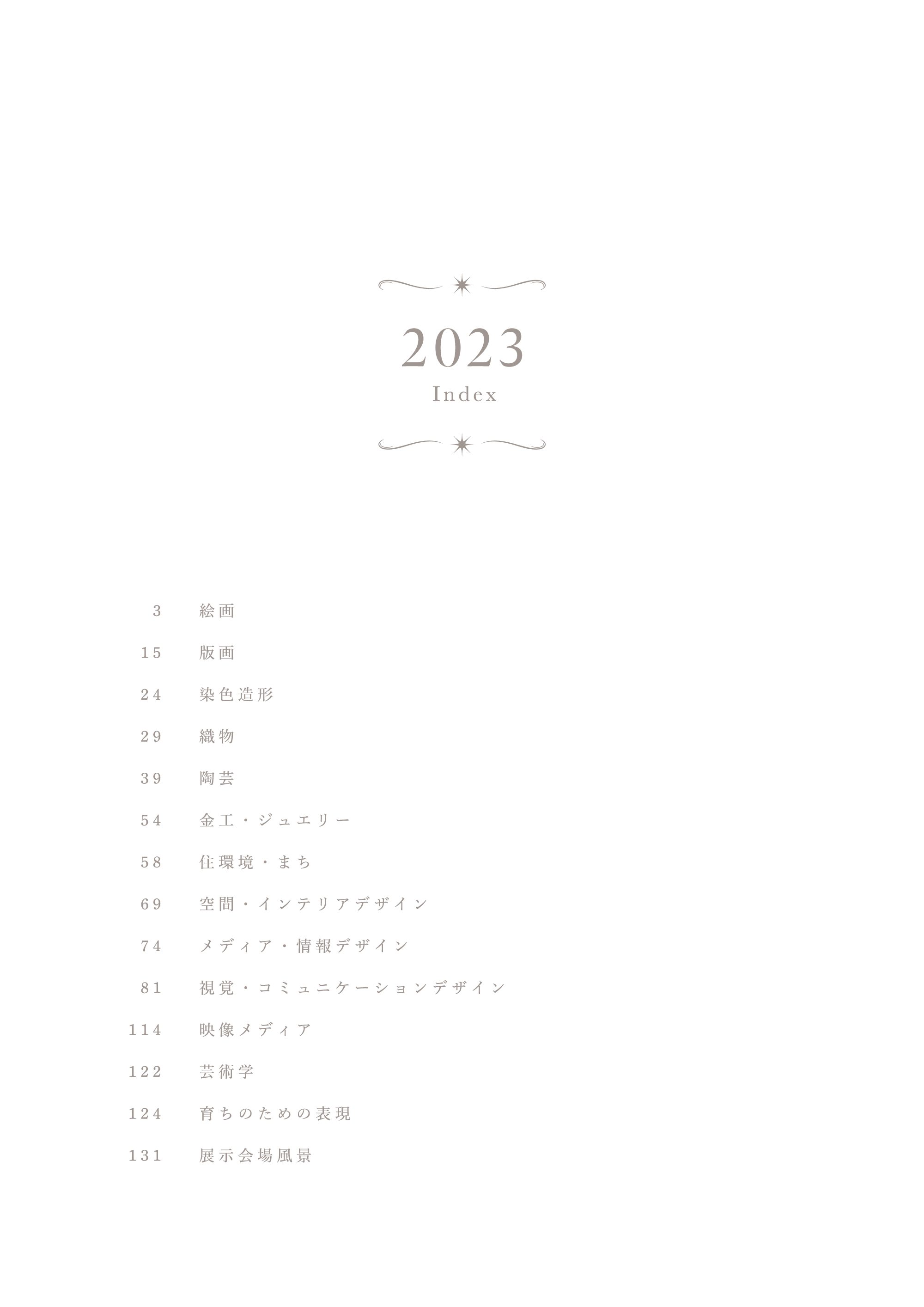 ・前年まで索引ページは文字のみで構成されていたそうですが、少し寂しい印象だったためタイトル部分に華やかさを加えることにしました。表紙や中表紙と同じく、空のイメージに合わせて星のフレームを配置しました。細い線としなやかな動きでエレガントさを表現しています。