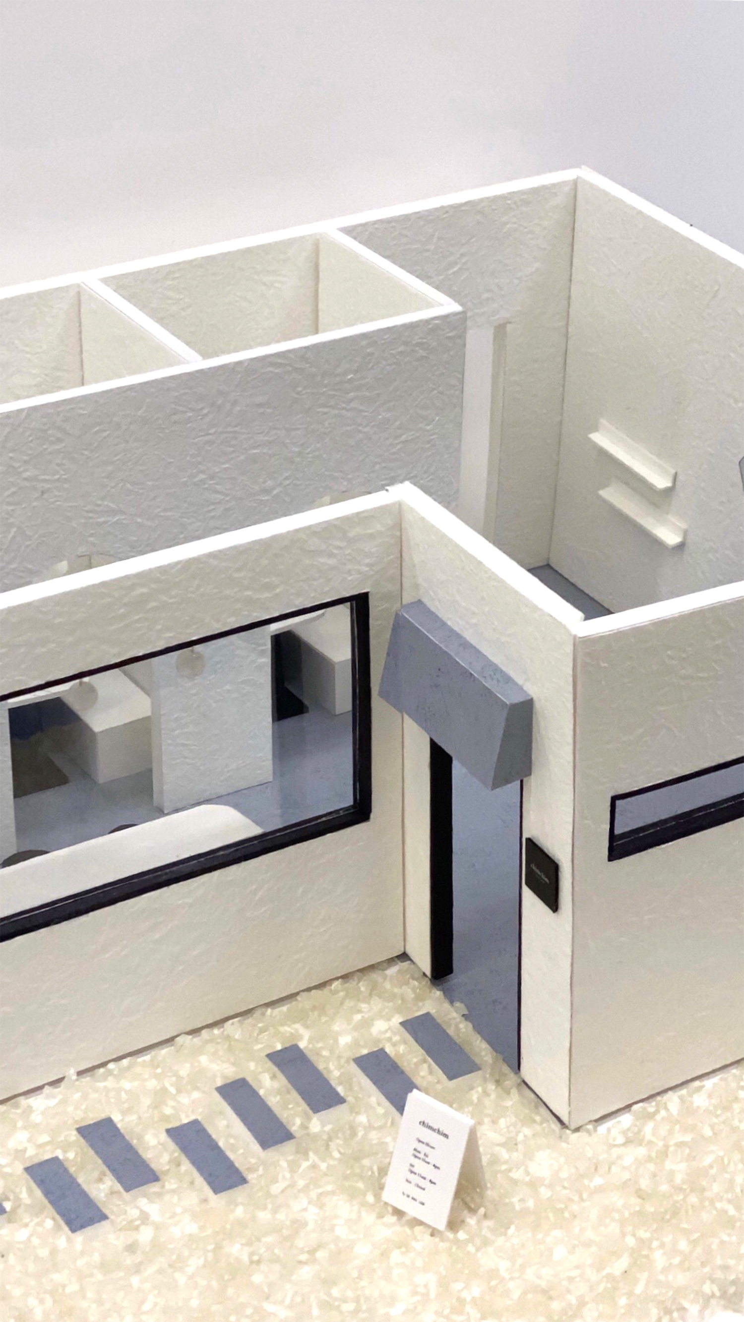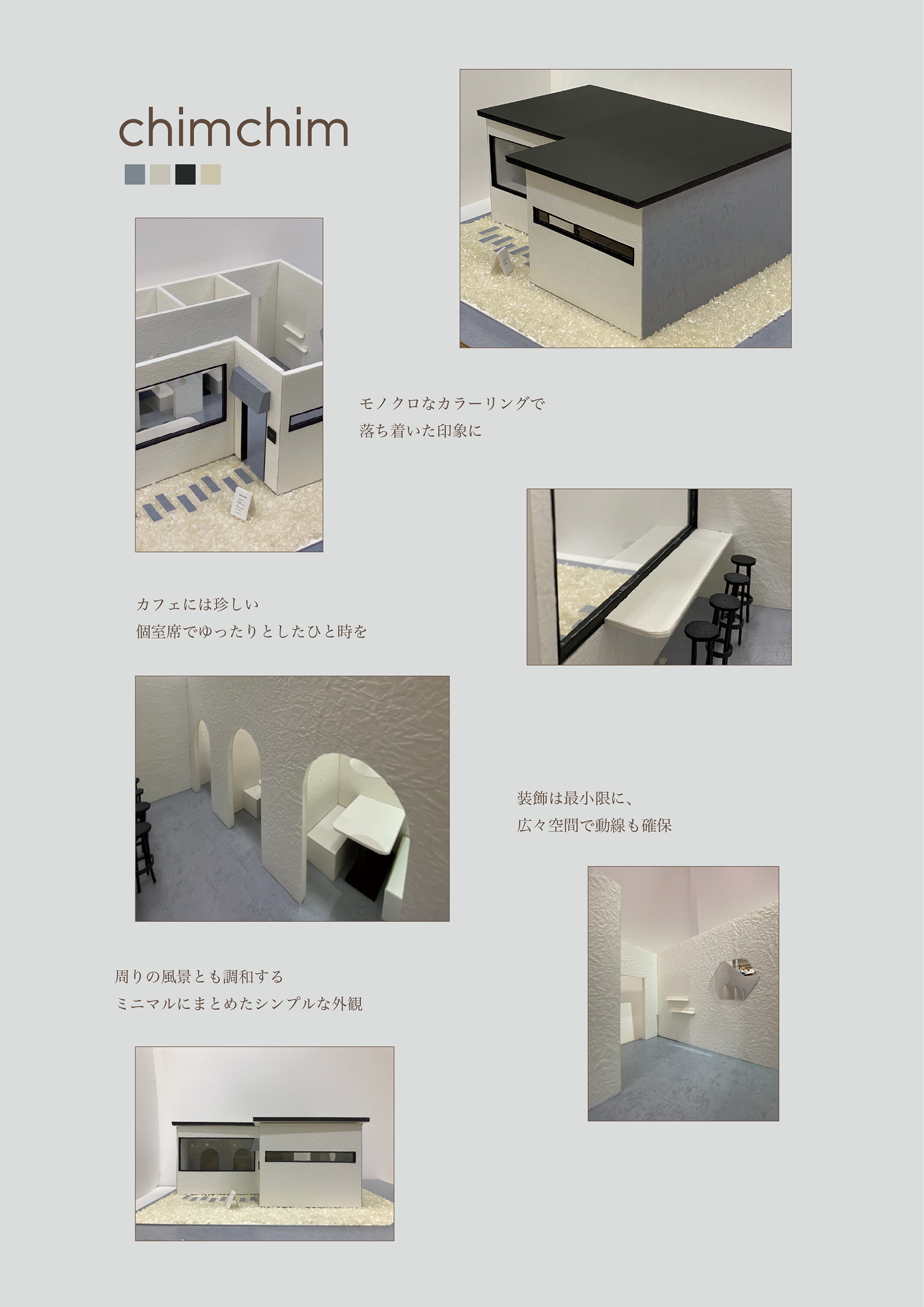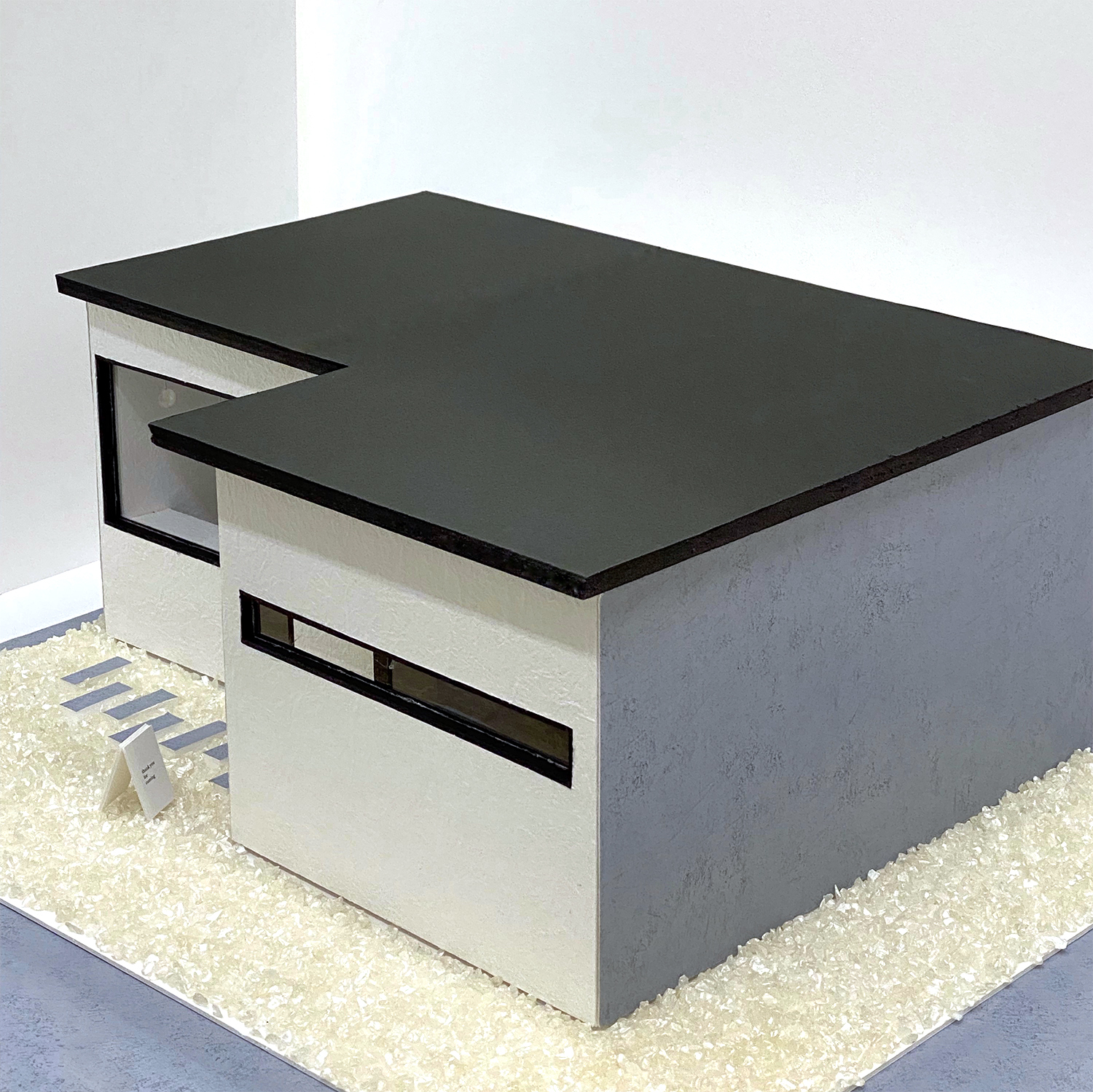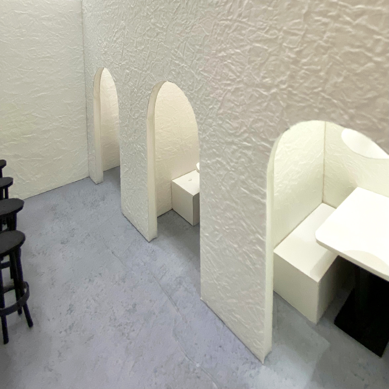大学3年後期の授業課題です。カフェのデザイン・模型制作を2人1組で行いました。実際にカフェを巡って雰囲気やデザインをリサーチし、取り入れたい要素を話し合いました。その結果、「無機質」と「個室」をキーワードに制作することになりました。具体的には、モノトーンの色合いやコンクリートのような冷たい印象の素材、シンプルで直線的な形状を基調に、プライバシーに配慮した個室スペースを取り入れた設計にしました。