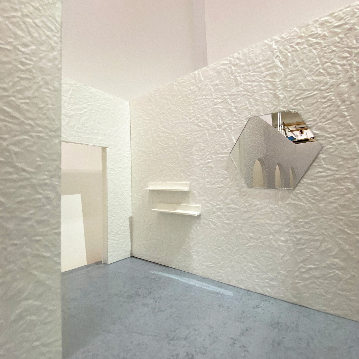 ・無機質さがコンセプトではありますが、色味や素材感が単調すぎたとも思えます。壁や床のテクスチャに変化を加える、アクセントカラーを取り入れる、植物を配置するなど視覚的に飽きさせない工夫が必要でした。