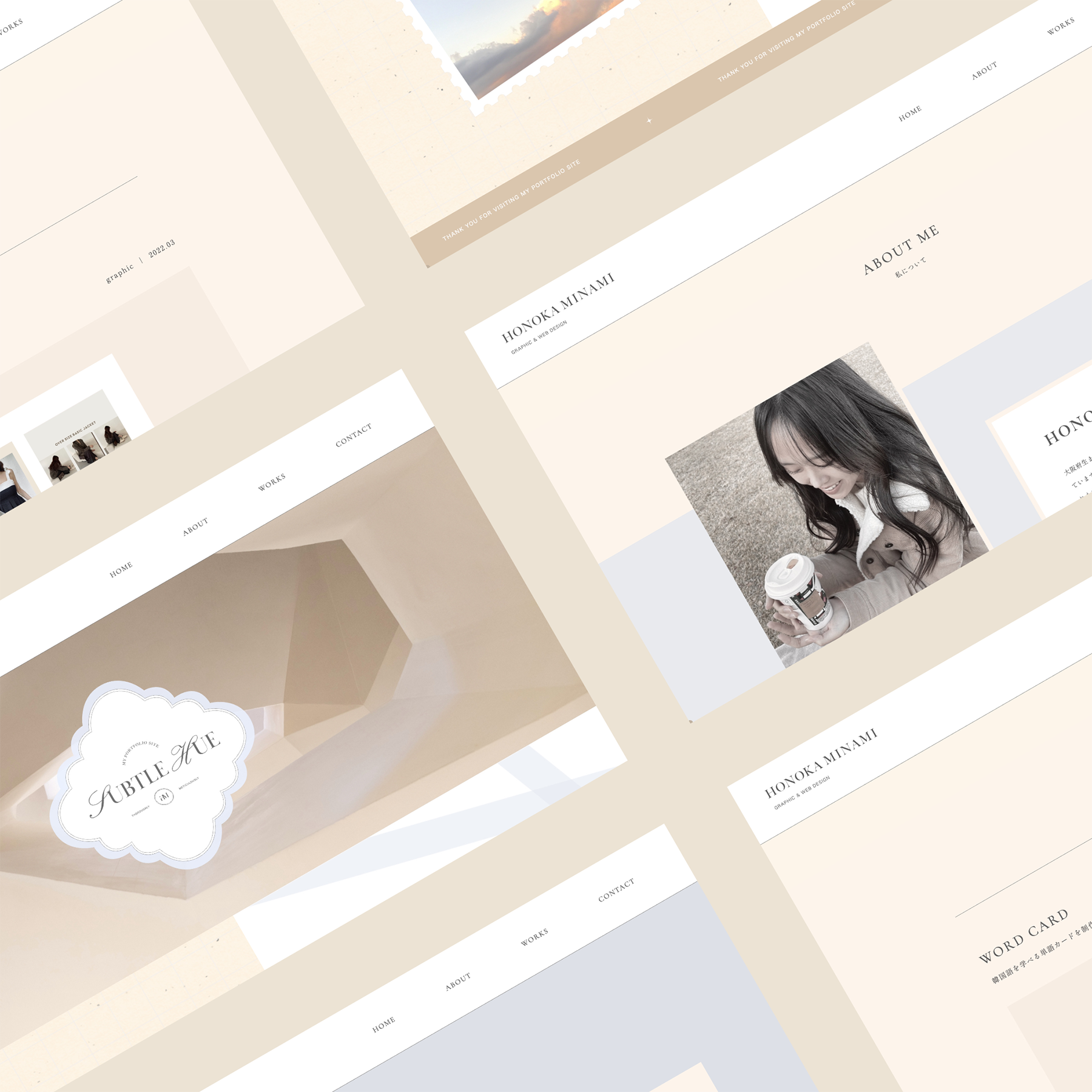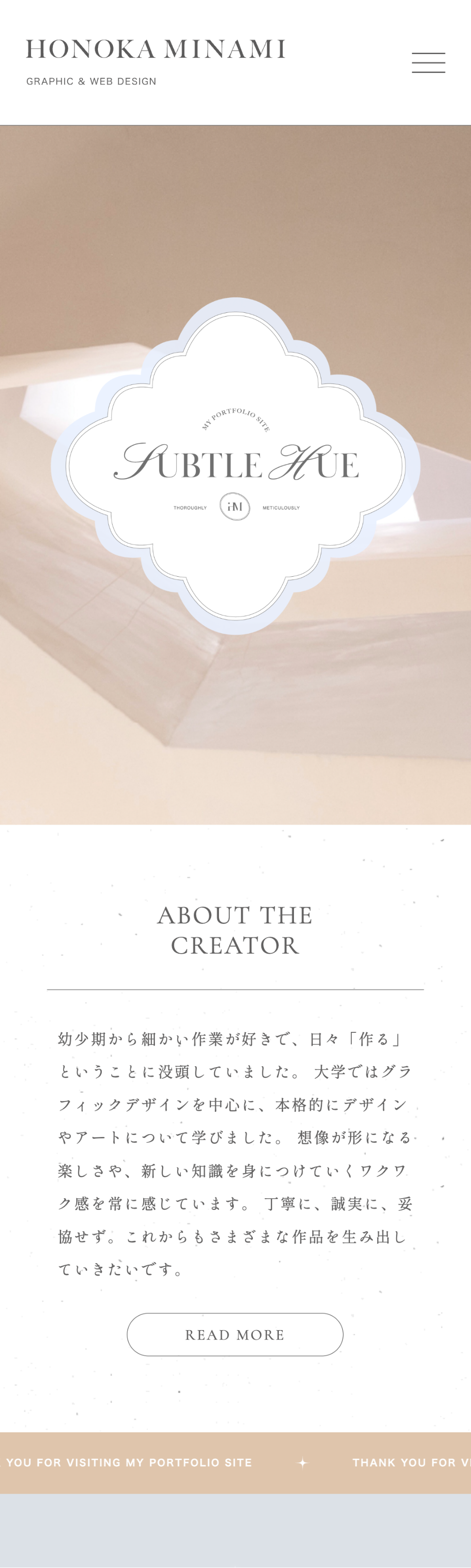 就職活動にあたり、これまでの制作物や自身のプロフィールについてまとめたポートフォリオサイトを制作しました。ポートフォリオ自体も一つの作品として、タイトルをつけました。SUBTLE HUEは「ほのかな色合い」という意味です。淡い色合いの作品が多いことと、自分の名前をかけたタイトルです。初めてサイトを一から制作したため、非常にシンプルな構造ですが、自分らしさと見やすさの双方を意識して制作しました。
