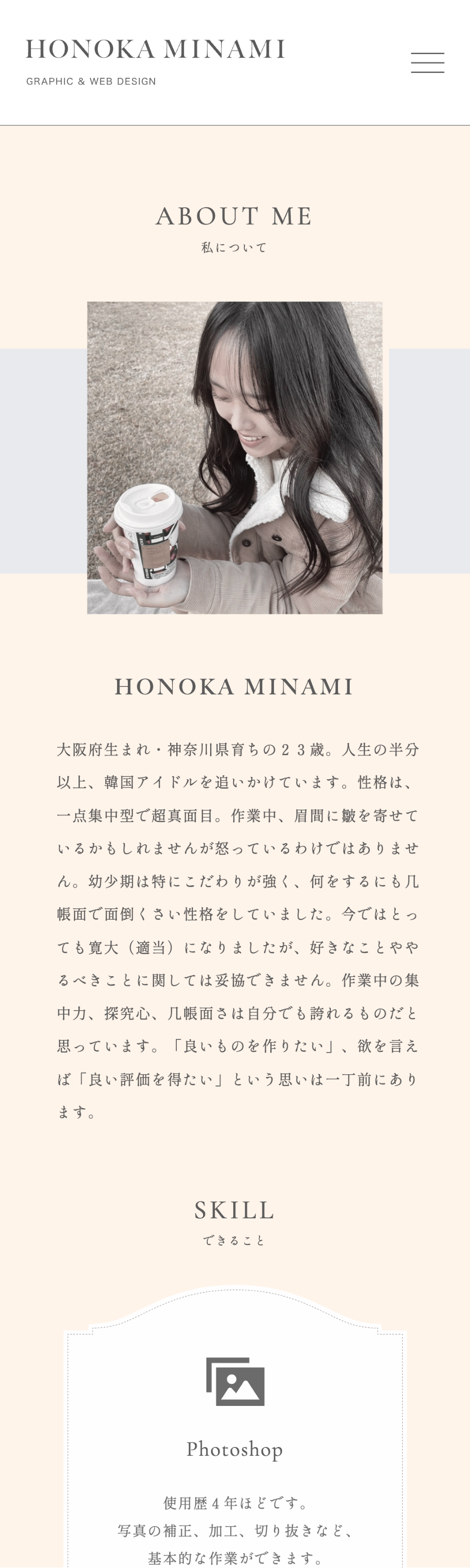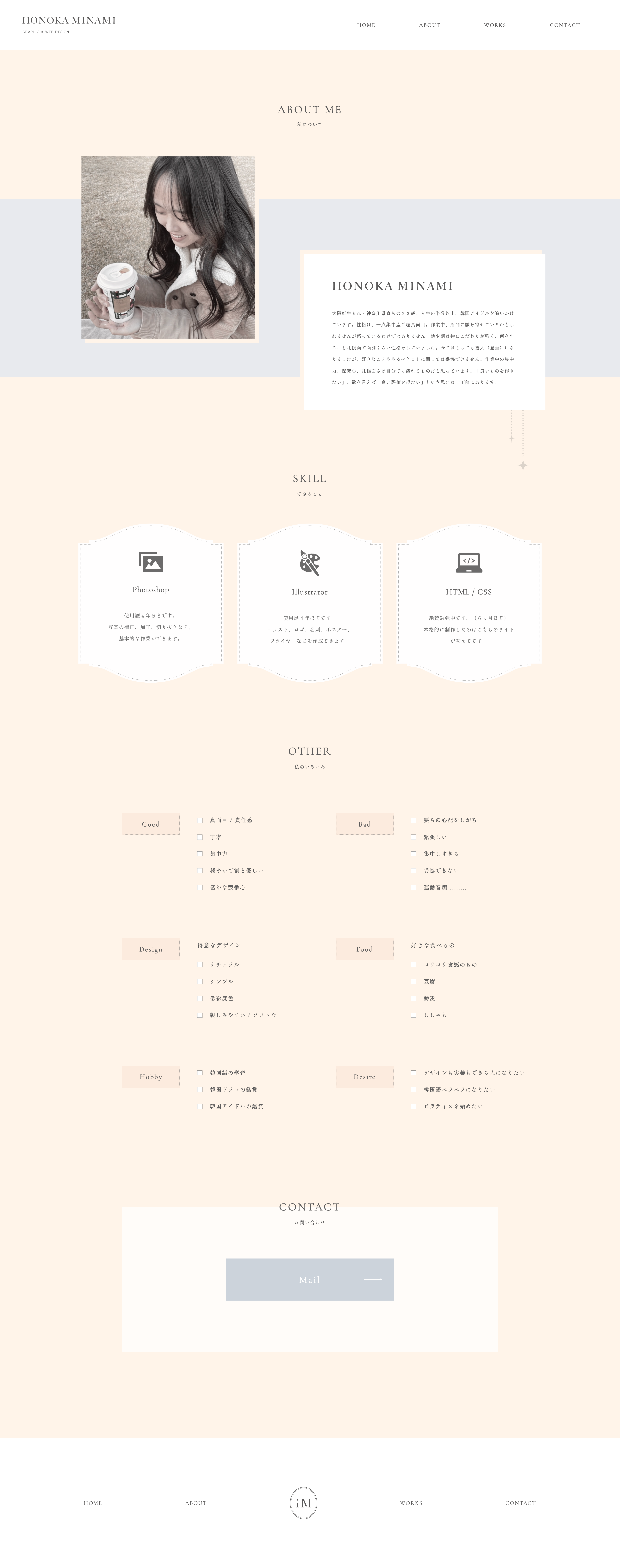 ・まず、HOMEページで全体の雰囲気や制作物をざっくりと把握していただけるようにしました。ABOUTページへの導線も設けており、さらに詳しい情報に興味を持っていただけた場合は、そちらをご覧いただけるようにしています。ABOUTページでは自分の特徴やスキルを率直に示し、人となりが伝わるようにしています。WORKSページでは各作品の詳細なビジュアルと説明を掲載し、スキルレベルを具体的に示しています。全体として情報が段階的に提供されるよう配慮しました。